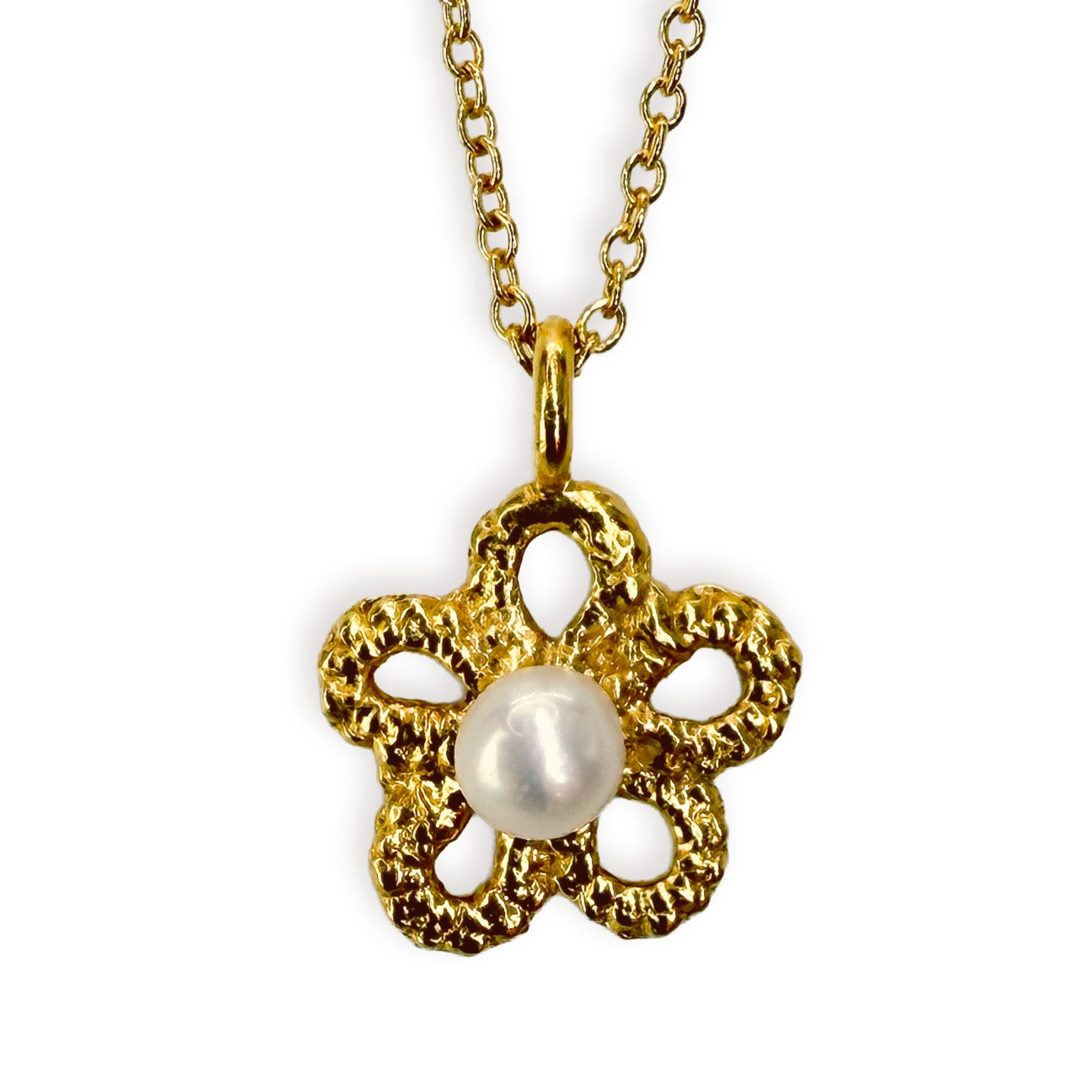 The Forget-Me-Not flower is first hand stitched in silk thread to produce the lace motif. This silk lace then undergoes a magical transformation, which culminates in the recreation of the design in solid silver. The freshwater pearl is the crowning glory on this unique necklace.